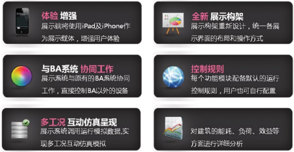 展示系统将结合以前项目经验,并进行多项功能改进,包括:增强用户体验、多种客户端访问方式、全新展示架构、与BA系统无缝交互,智能控制规则、多工况互动仿照呈现、建筑性能指标分析、详细分析报表等。