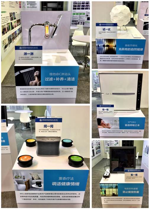本次展台最大亮点,是我院联合DELOS公司(WELL标准的编制者)展出的多项STAY WELL认证产品,最新的健康建筑技术成果让每一位参观者都能亲身感受到健康建筑所带来的直观体验:运用过滤+补养+清洁的模式的淋浴龙头,注入的维他命C让使用者每天拥有光滑的皮肤和头发;可模拟自然光变化效果的昼夜节律光源灯具,能对使用者的舒适度、清醒度、情绪变化和睡眠质量产生积极的调节作用;可有效去除空气中的过敏原、霉菌孢子、烟尘、异味以及其他污染元素的空气净化器,带给使用者更为洁净的空气,重造呼吸之本;运用“干散发科技”的香氛装置,通过散发出不同的自然香味来调适健康情绪,帮助使用者振奋精神或催进睡眠;可与室内智能照明系统搭配使用的电致变色玻璃,能将室内的自然光控制在绝佳的照度,防止视觉伤害,显著提升使用者的工作、生活舒适感。